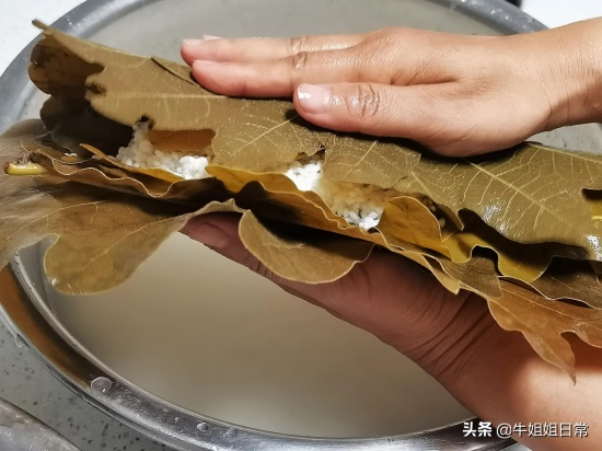 手掌打开,两个大叶子对头放,然后搭上大小合适的粽叶,中间放一个完整漂亮的,抓上两把米。