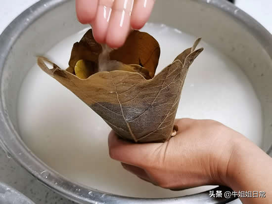 粽叶洗净,入沸水煮至变色,约2到3分钟左右。