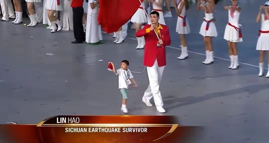 2008年,北京奥运会开幕式上,姚明拿着五星红旗,带着中国代表团慢慢走进会场。而在他后面的,正是那个在汶川大地震中勇敢自救还救出两名同学的九岁小男孩——林浩。这一刻,林浩不仅代表了中国的新生力量,还承载着很多人在灾难面前不放弃的精神。