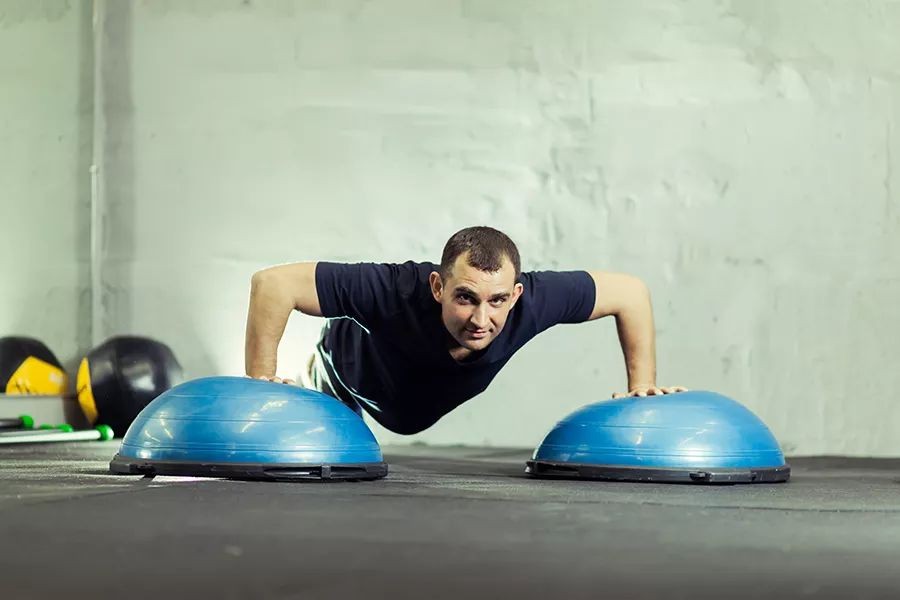 2.双臂屈肘,身体下沉,降至胸部靠近BOSU球,保持腹部收紧;