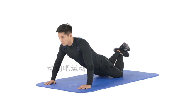 1.俯撑姿,弯曲膝盖并让脚踝在身后交叉,使膝关节支撑于地面,双手分开,手臂伸直,身体从头到膝关节呈一条直线;