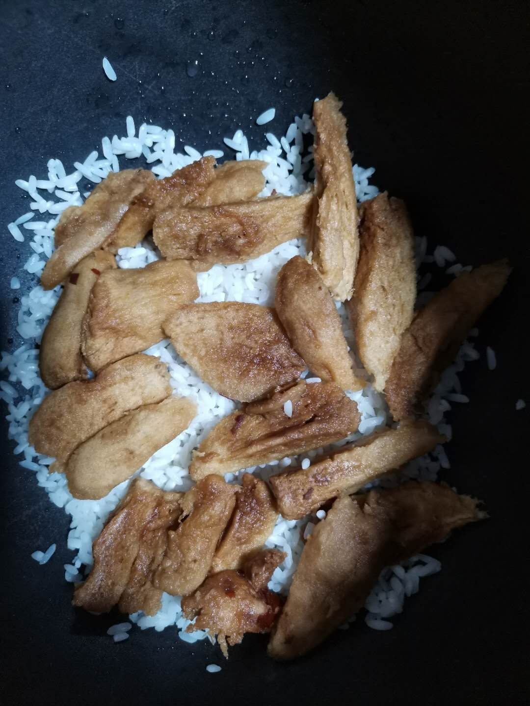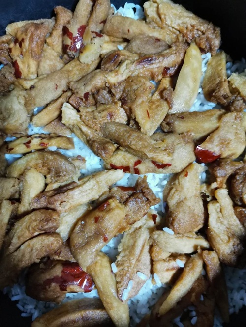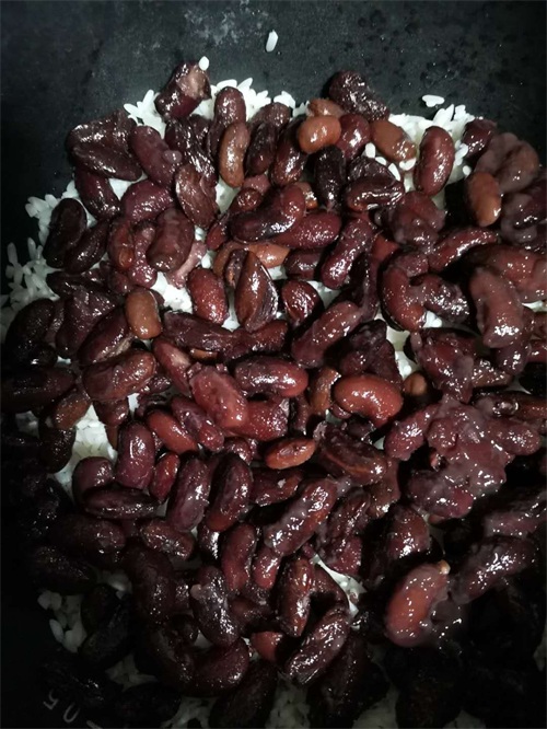 一切准备停当,开始往家家都有的电饭锅里装材料。装锅这个事,就和三明治一样,面包部位就是米的部位,夹层就是红枣和红芸豆,铺一层米,放一层枣,再铺一层米,放一层煮好的红芸豆,再铺一层米,以此类推,直到把所有材料都放完。放红芸豆时最好撒一些白砂糖,因为芸豆本身有一点点味道,没有白砂糖的加持,口感不好。
