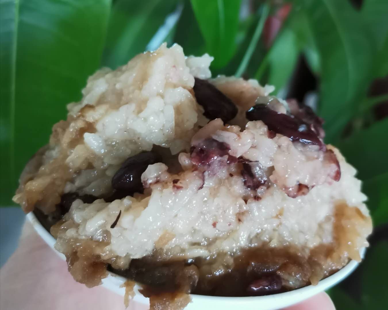 此时,按下电饭锅的煮饭键,可以休息啦!喝茶、追剧、刷手机,随您啦!40分钟左右,咱的甑糕就出锅啦!盛甑糕也是个技术活,看小摊上的老板总能保证每碗甑糕层次分明,红白相间。