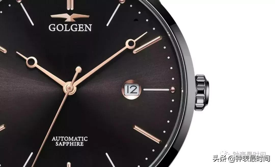 12点钟位置的古尊LOGO边沿细腻没有任何的毛刺感,日历窗边沿经过精细打磨削角,让人在观感上有种圆润的亲切感。6点钟位置标注了“AUTOMATIC”、“SAPPHIRE”,说明了这款表是一款自动机械表,表镜采用高级的蓝宝石玻璃材质。