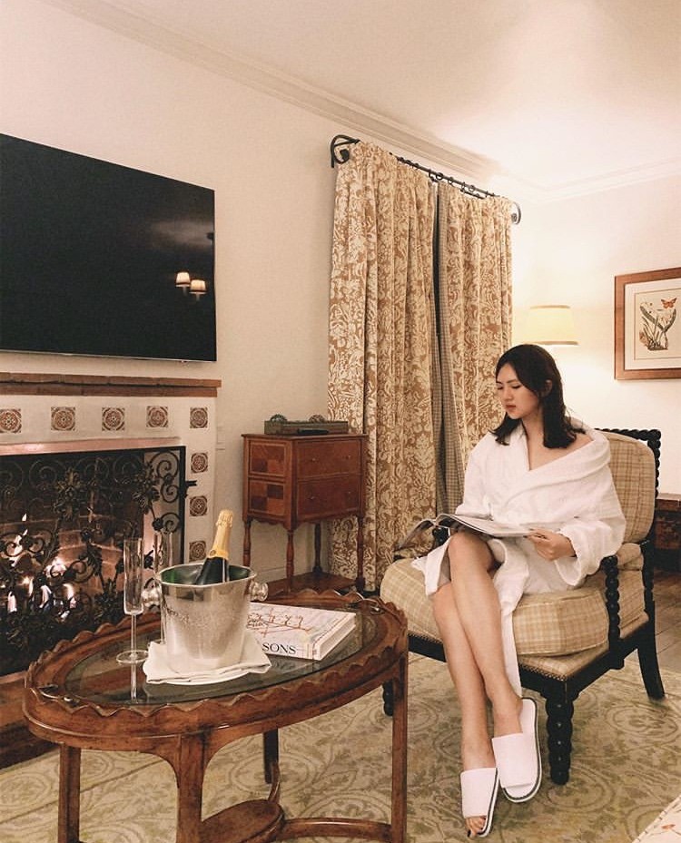 时髦的人就是不一样,普通的浴袍也能够穿得不一般,把领口往下拉一点看着略性感,双腿叠放很迷人,房间内豪华的内饰一看就不简单。
