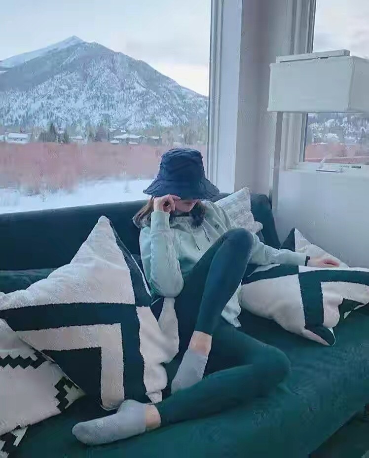现在这个阶段国外形势比较严峻,姚安娜选择了回国,乖乖宅在家也穿得很时髦。马克龙色的卫衣搭配瑜伽裤,摆的酷酷的pose拍照。窗外意外暴露了别墅的外景,空旷的简直可以当跑马场了,不远处就是山。