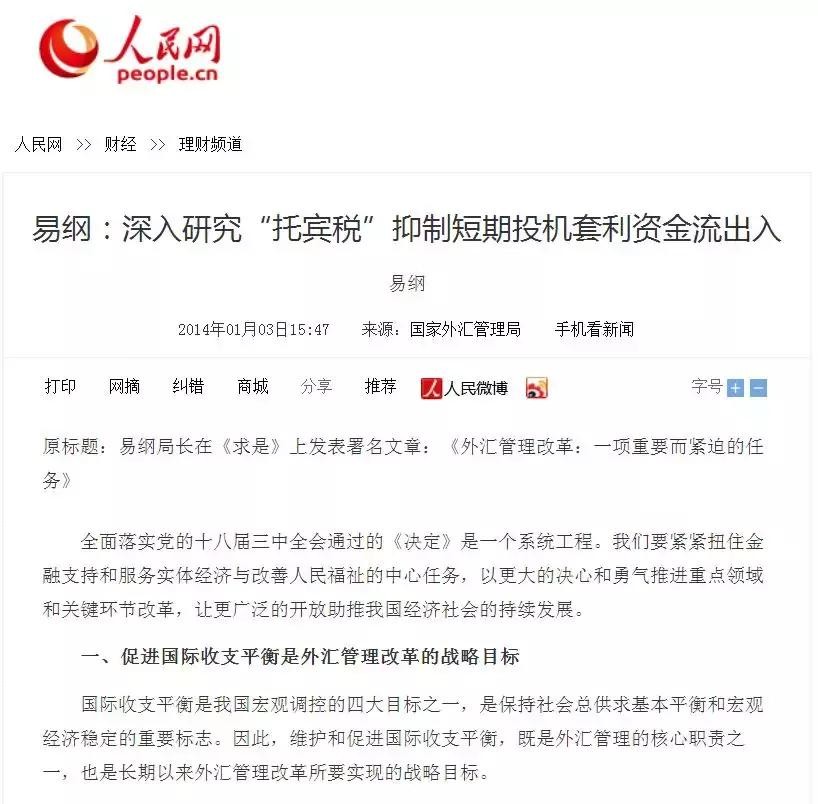 中国官方最早研究“托宾税”的,是在美国拿下经济学博士学位的易纲,他是现任央行行长,曾担任了7年的国家外汇管理局局长。2014年1月,易纲在《求是》上发表署名文章,提出:“深入研究托宾税、无息存款准备金、外汇交易手续费等价格调节手段,抑制短期投机套利资金流出入”