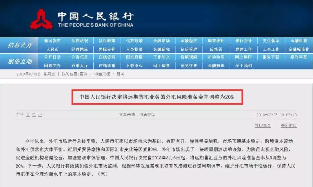 今天(8月3日)夜,外汇市场风云突变。央行于晚上7点多,通过其官方网站发布了一个重要消息——“将远期售汇业务的外汇风险准备金率调整为20%”(此前准备金率为0%)!