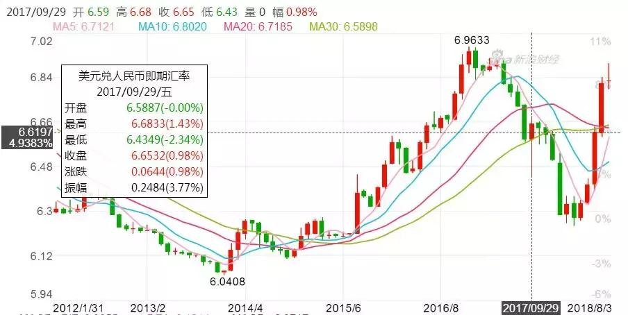 今年4月初以来,或者说中美博弈正式开始以来,人民币结束了2017年1月以来的升值期,开始持续贬值。人民币兑美元中间价从4月2日的6.2764贬值到了8月3日的6.8322,贬值幅度超过了8%!