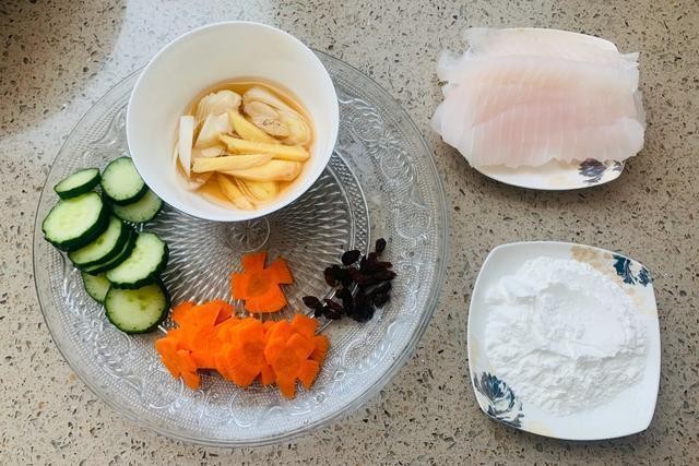 辅料:葱、姜、料酒、胡萝卜 、黄瓜、枸杞、盐、淀粉、胡椒粉
