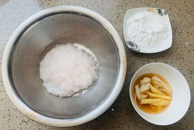 第二,打好的鱼泥中加入淀粉,葱姜酒水,盐需不断搅拌上劲,必须沿同一个方向搅拌。