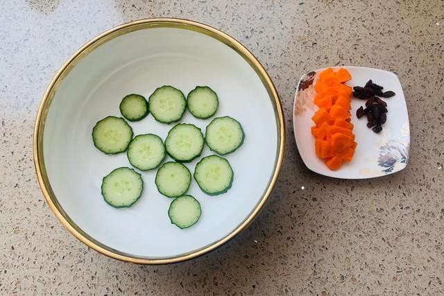 把食材洗干净,葱切段,姜切片放入料酒中备用,胡萝卜切片、黄瓜切片备用