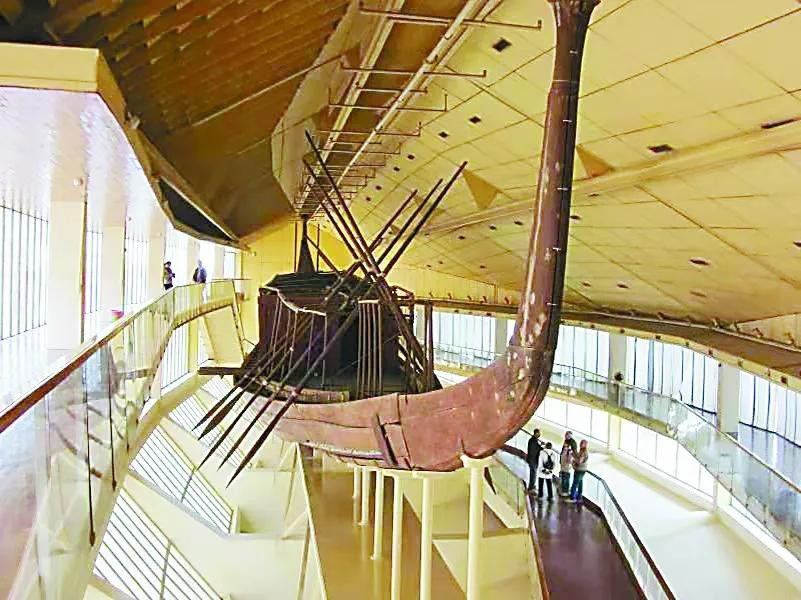 参观时,人们必须按要求穿上防辐射的特制套鞋。《环球时报》记者注意到,博物馆共分三层,一层是当初发掘出太阳船时的坑穴原址,二层收藏有发掘时的大量照片、各类史料、太阳船的模型以及船上的碎木片、破席片和棕绳等实物。三层摆放着巨大的太阳船本身(如图)。太阳船也叫“胡夫太阳船”或“胡夫金字塔船”,是专门为法老胡夫建造的。据考证,这艘“太阳船”距今已有4500多年的历史。