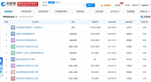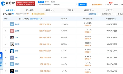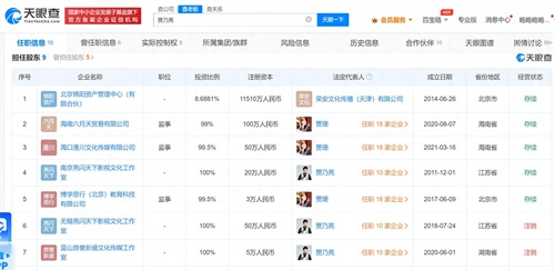 天眼查App显示,贾乃亮关联的10家企业中6家为存续状态,其中,南京亮闪天下影视文化工作室和象山亮闪影视文化工作室为其个人独资企业和个体工商户;海口漫川文化传媒有限公司、博学思行(北京)教育科技有限公司、海南六月天贸易有限公司均由贾乃亮和姐姐贾珊共同持股,由贾珊任法定代表人、执行董事、总经理等,贾乃亮任监事,贾乃亮持股比例均达到或超过99%;北京锦阳资产管理中心(有限合伙)则由贾乃亮持股约8.69%,其他明星合伙人还包括刘涛、李晨、秦岚、霍思燕等。