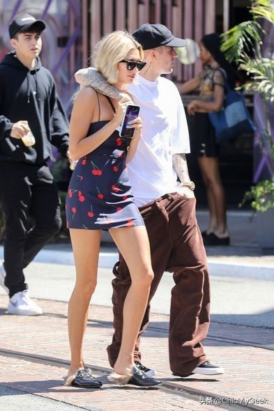 贾斯汀·比伯穿着白色T恤与阔脚裤,海莉则是穿着樱桃图案的短连身裙,两人风格不同,但一样很夏日!