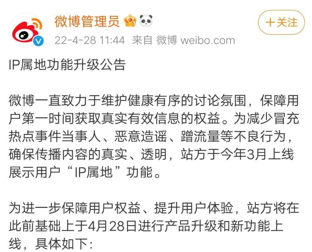 4月28日,微博官方宣布,今年3月上线的展示用户IP属地功能,现已全量开放,用户发表评论均会展示IP属地,同时还上线了“个人主页一级页面展示IP属地”功能。