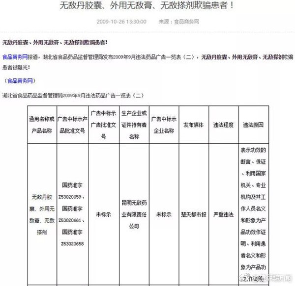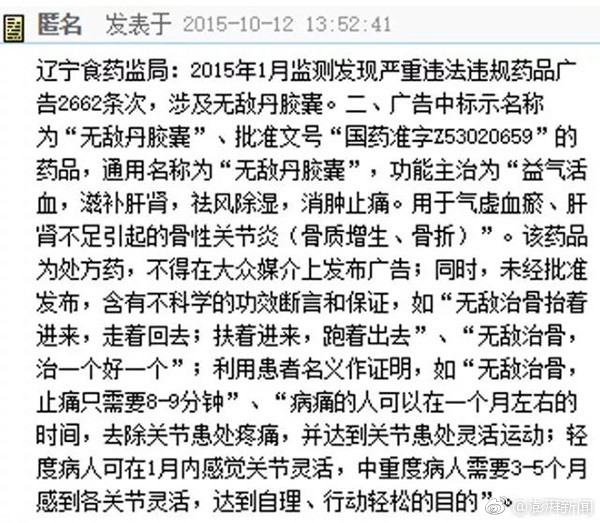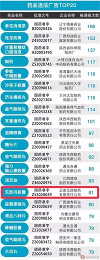 【号称“扶着进来跑着出去”,云南“神药”无敌丹被通报81次】日前,国家市场监管总局官网公布了8000余件食品保健品欺诈和虚假宣传案。在药品违法广告TOP20榜单中,云南无敌丹胶囊赫然在列,且被通报次数多达81次(统计日期2001年-2018年4月)!生产厂商云南无敌制药有限责任公司官网显示:该公司成立于1993年,是“中华老字号企业”,生产的系列药品拥有数百年的历史文化。该药曾经的广告语是这样的:“无敌治骨,抬着进来,走着回去;扶着进来,跑着出去!”“用了3个疗程……腰不疼、腿不酸、脚趾也不凉,什么都好了!”其被全国各地通报的大多数原因都是:宣传和广告语不科学地表示功效的断言、保证,严重欺骗和误导消费者。春城晚报微信公号