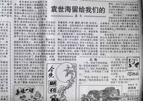 当年我在报刊上发表了两篇文章:在《人民画报》发表的文章是《架子花脸铜锤唱 艺德双馨曲动人——记京剧大师袁世海》;之后又在《今晚报》发表了《袁世海留给我们的》。