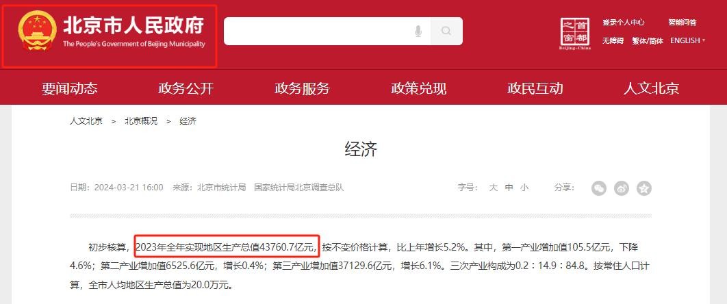 2023年,北京市全年实现地区生产总值43760.7亿元,这个数字如果换算成美元大约是6251.5亿美元。