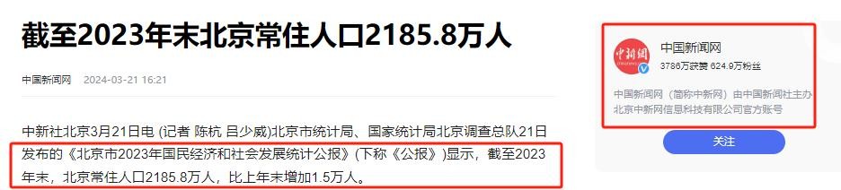 中国新闻网:截至2023年末北京常住人口2185.8万人