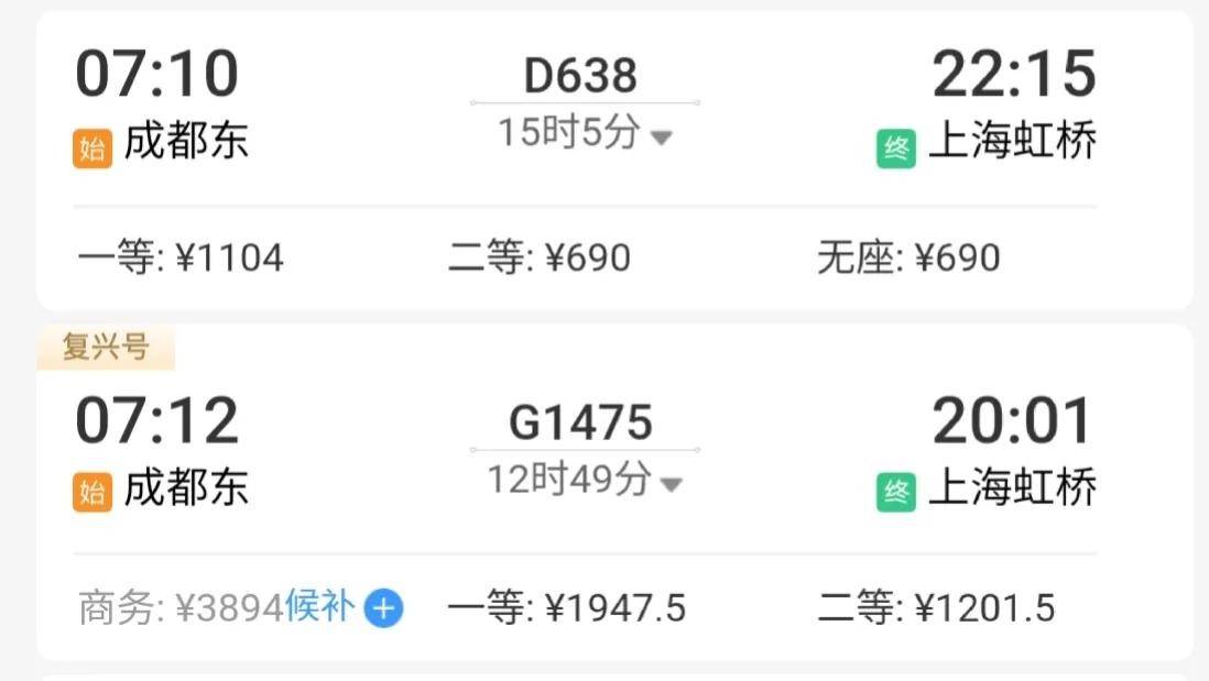 目的地:如果你的目的地就在成都东或上海虹桥之间,那么G1475次和D638次对你来说可能没有太大区别。