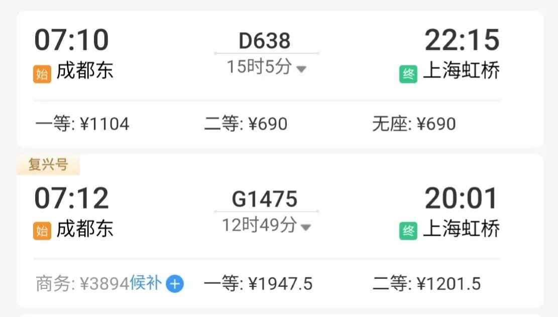 选哪个?列车D638次G1475次 都是成都到上海,前后相差两小时14分