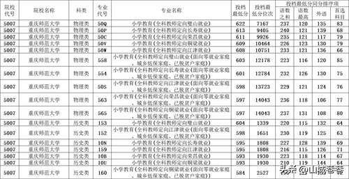 历史类投档分数线在607-588分,最高的是定向黔江区属中学任教的历史学607分,其次是定向万州区属中学任教的历史学605分,最低的是定向巫溪县属中学任教的历史学、汉语言文学、英语588分,最低分位次2251.