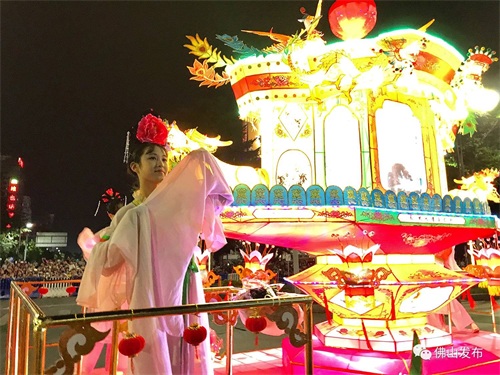 第一辆彩车头牌灯《佛山韵律》 花车上站着四位婀娜多姿的仙女,向沿途市民挥手示好!彩车上鲜花和五彩装饰,展示了佛山秋收的场景,也展示了佛山精湛的传统手工艺。
