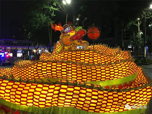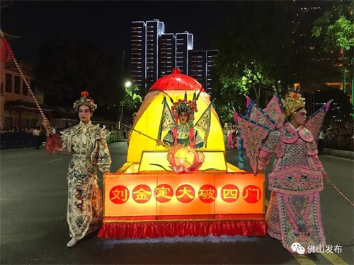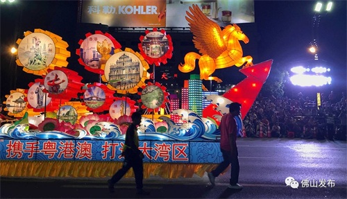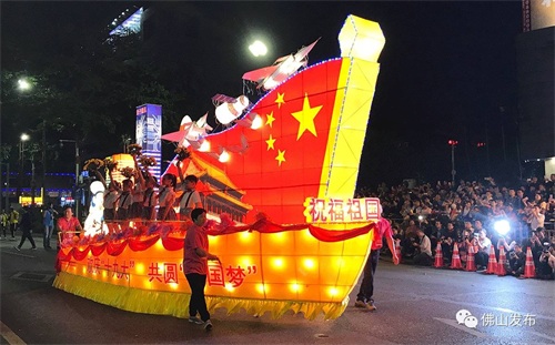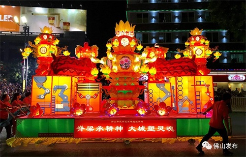 彩车四《大城匠心》寓意佛山脊梁承精神,大城塑灵魂!以“佛山制造”的佛山传统手工艺品:佛山彩灯、佛山狮头作为这辆彩车的主体。