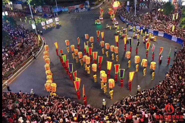 巡游开始啦!唢呐锣鼓声中,秋色信号灯队伍领头,火把手接后,紧跟着的就是《佛山秋色》大灯笼和“飞报马”队伍!