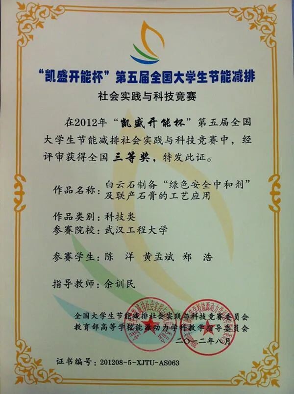 “凯盛开能杯”第五届节能减排社会实践与科技竞赛三等奖