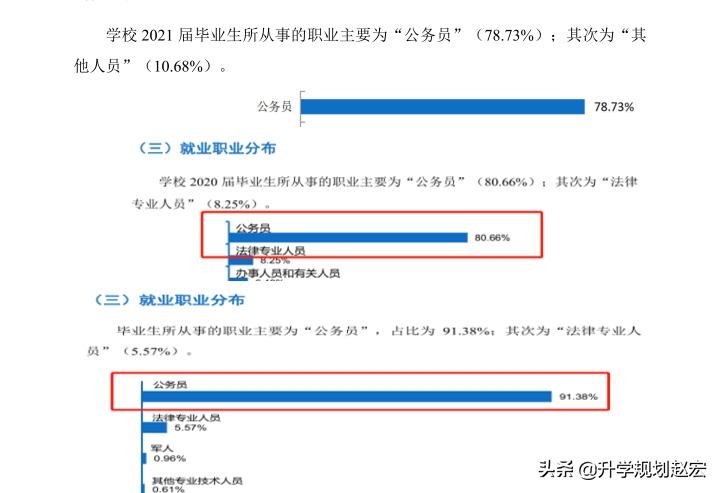 同时在从事的职业当中,公务员的比例是78.73%,主要流向单位类型为“机关”的占比78.82%;其实整个数据之间有差异的,毕竟来源不一样,联考的数据过了,也有可能因为地域的原因放弃;毕竟联考分数低的选择不会占有优势;2019届的公务员比例是91.38%;2020届的比例是80.66%,下降了10多个百分点;