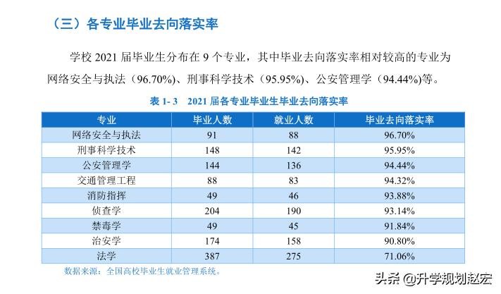 从近三年的数据来看,总体就业率都是差不多的,2019届89.51%,2020届85.42%,2021届88.73%;对于2020届的数据咱们前面说过,具体可以看下文,这个数据是全部专业的整体数据,但是大家关心的都是提前批招生的专业,也就是可以参加联考的这些专业,本二批招生的法学专业就业率较低,所以整体会有下降;接下来咱们详细看看各个专业的就业情况,以及入警率怎么样?