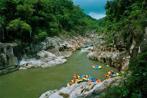 由于较大的地势落差,再加之常年雨水丰沛,幽深的峡谷还提供了最刺激的漂流水道,坐在在皮艇上顺流而下,水流落差急缓有致,险象横生,凉爽宜人,使得五指山夏天的漂流远近闻名。