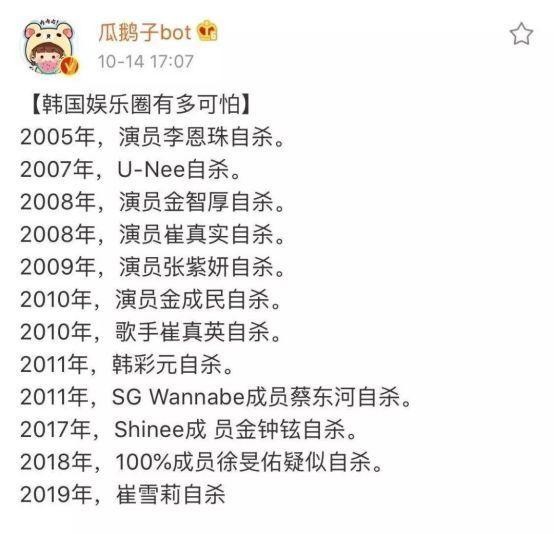 于是我们几乎每年都看到了艺人自杀的新闻,崔真实、张紫妍、朴龙夏等数十位韩国艺人都是自杀身亡的。