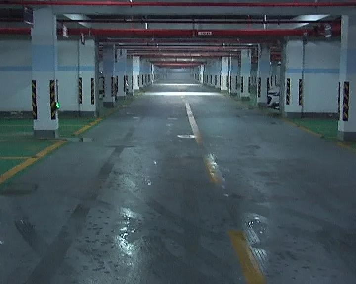 地下车库,明显能发现地面积水很多,比较潮湿,不少车位都有小水洼。