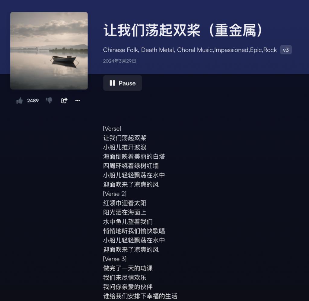 而且,有国内用户用很多耳熟能详的歌词作为基础,让 Suno 重新生成曲调," 重制 " 了《让我们荡起双桨》《声声慢》《以父之名》《夜曲》《七里香》等经典曲目,生成效果令人惊艳。