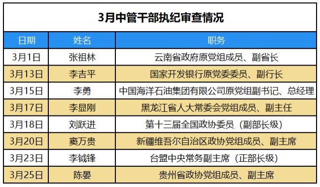 现代快报记者梳理中央纪委国家监委网站发现,3 月接受审查调查的中管干部共 8 名,中央一级党和国家机关、国企和金融单位干部 16 名,省管干部 48 名。值得注意的是,台盟中央常务副主席李钺锋是今年首个被查的正部长级官员。