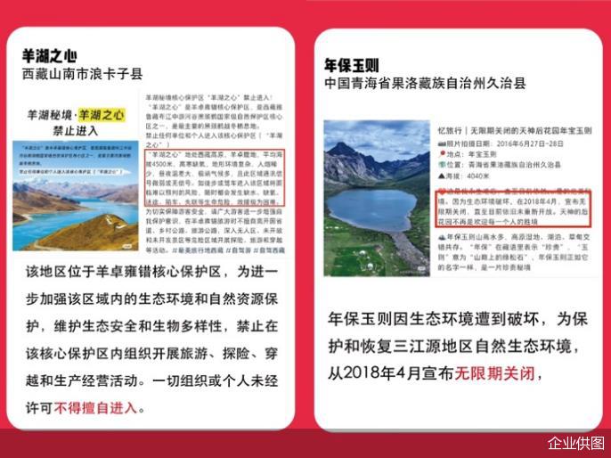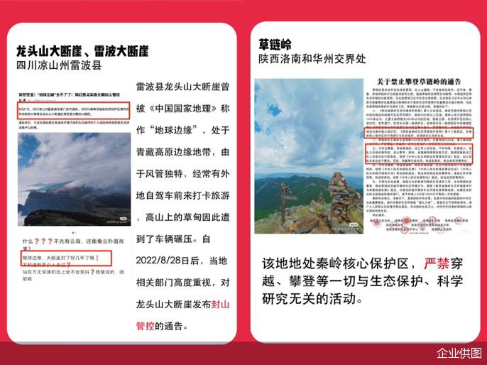 3 月,小红书在站内公示了一批徒步危险地,如西藏的羊湖之心,青海的年保玉则,四川的龙头山大断崖、雷波大断崖等。" 随着徒步的流行,我们注意到越来越多户外爱好者寻求新的探险。挑战自身、欣赏自然的同时,安全依然是第一位的。许多地方不仅具有极高的自然保护价值,复杂的地形和天气条件也为徒步探险带来了极大风险,我们强烈呼吁大家避免进入上述区域。" 小红书平台治理相关负责人表示。