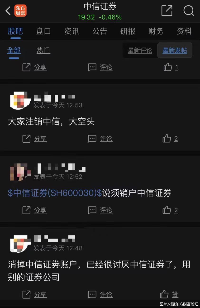 近日来,部分网民在中信证券股吧及微博上表示已将中信证券账户注销,还有人在股吧鼓励投资者注销中信证券账户,并戏称:" 你销户了吗?"