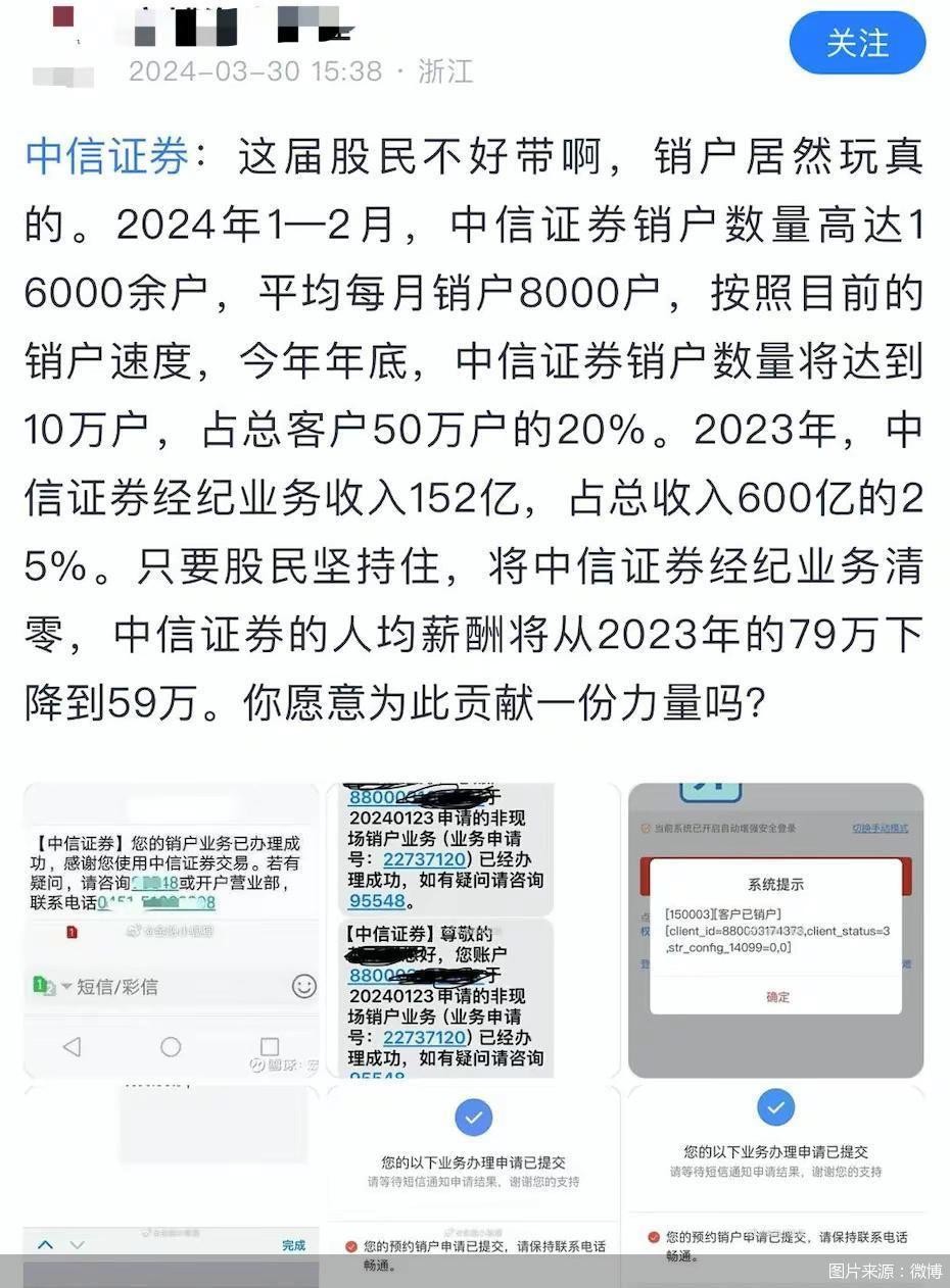 与此同时,近期也有部分自媒体发布消息称:"2024 年 1 — 2 月,中信证券销户数量高达 16000 余户,平均每月销户 8000 户,按照目前的销户速度,今年年底中信证券销户数量将达到 10 万户,占总客户 50 万户的 20%。"