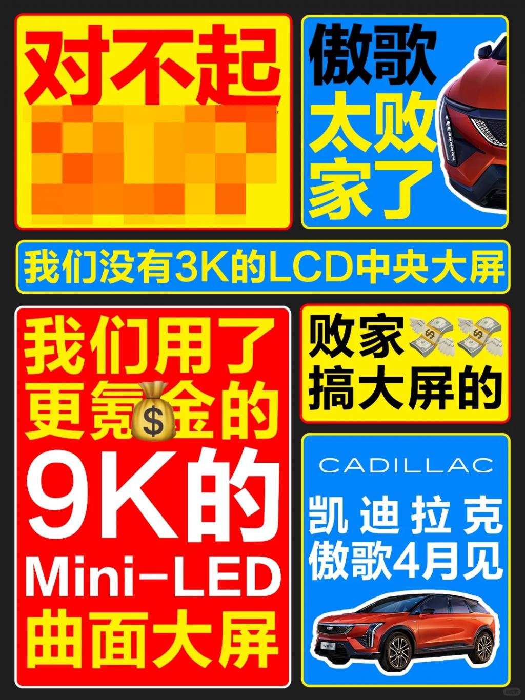 对不起 XX,傲歌太败家了。我们没有 3K 的 LCD 中央大屏,我们用了更氪金的 9K 的 Mini-LED 曲面大屏。败家搞大屏的凯迪拉克傲歌 4 月见!