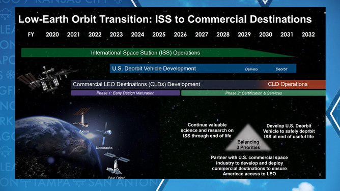 全球航天机构计划在国际空间站运行数十年后,于 2030 年左右将其停运。美国宇航局表示,太空的温度、压力和其他环境因素太过极端,以至于空间站无法无限期运行。美国宇航局目前正计划建造一艘退役推进器,用于控制国际空间站安全坠毁。退役推进器将使空间站能够在坠落到地球之前进行必要的操控,使其坠入预定的人迹罕至的海洋区域,从而最大程度降低对人类的威胁。