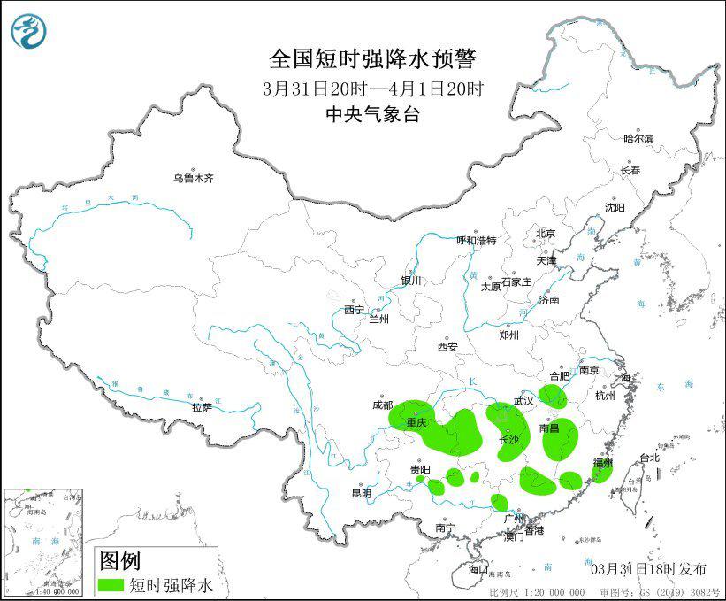 预计,3 月 31 日 20 时至 4 月 1 日 20 时,湖北东南部、湖南、江西、福建西北部、四川东部、重庆中西部、贵州东部、广西北部、广东北部等地部分地区有大到暴雨,其中,湖北东南部、湖南东北部、江西东部和南部、福建西北部、广东东北部等地局地有大暴雨(100~150 毫米)。上述部分地区伴有短时强降水(最大小时降雨量 30~50 毫米,局地可超过 70 毫米),局地有雷暴大风和冰雹等强对流天气。