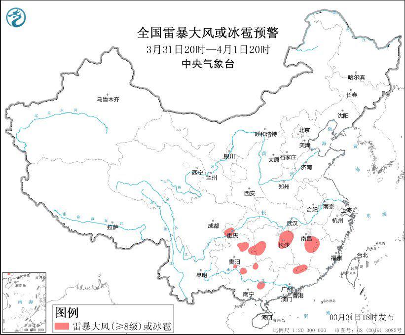 预计 3 月 31 日 20 时至 4 月 1 日 20 时,湖南西部和东北部、江西东部和南部、福建西部、重庆西南部、贵州东部和南部、广西北部、广东东北部等地的部分地区将有 8-10 级雷暴大风或冰雹天气;此外,安徽西南部、湖北东部和南部、湖南、江西、福建东南部和西部、四川东部、重庆中南部、贵州东北部和南部、广西北部、广东北部等地的部分地区将有短时强降水天气,最大小时雨量 30-50 毫米,局地可达 70 毫米以上。