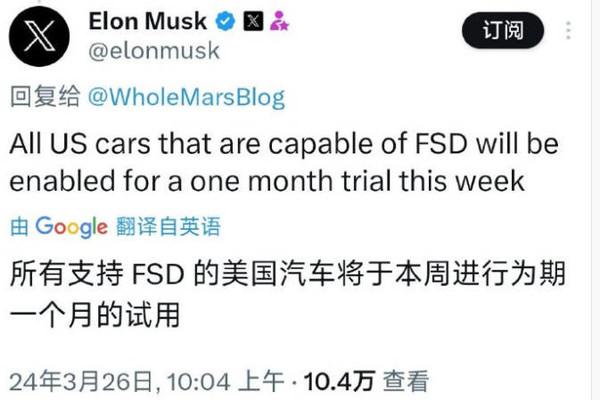 马斯克:美国适用FSD的特斯拉可以免费试用FSD一个月