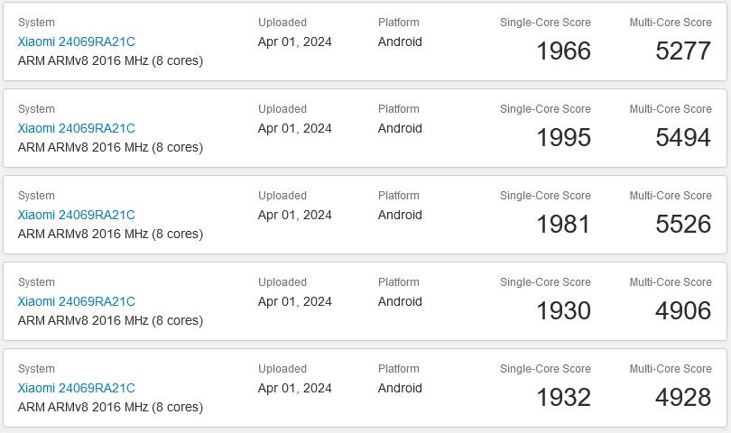 IT 之家 4 月 2 日消息,型号为 24069RA21C 的小米 Redmi 新机日前通过 3C 认证,显示支持 90W 快充之后,近日现身 GeekBench 跑分库,6.2.2 版本(按照多核最高)单核得分 1981 分,多核得分 5526 分。