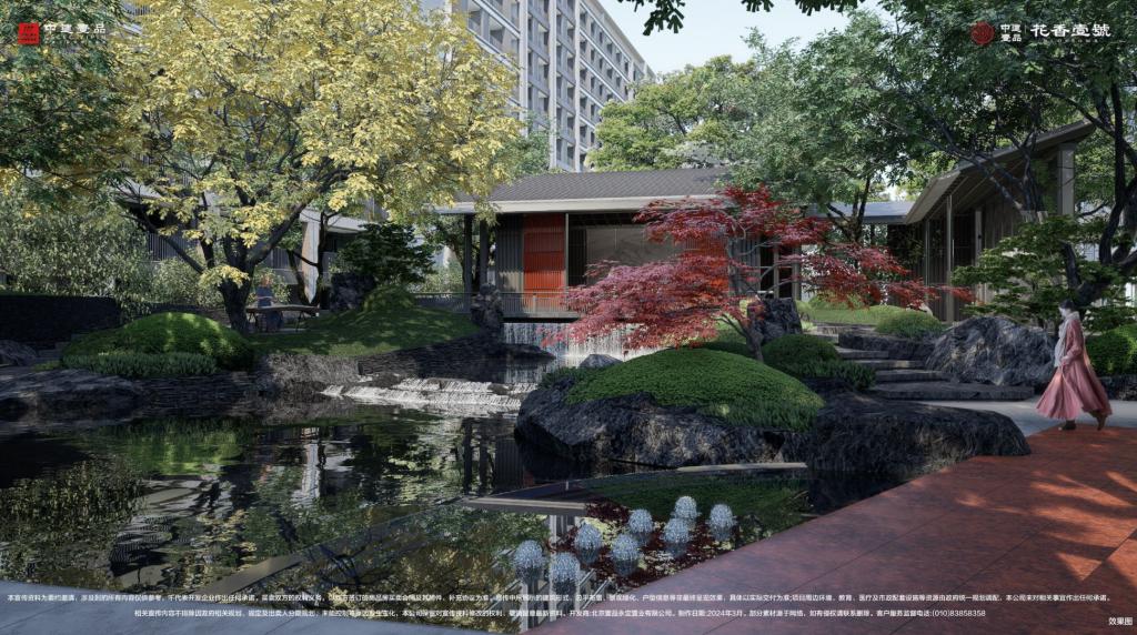 循迹 " 京都花乡 "、" 父子尚书 "、" 王熙别业 " 的历史文化脉络,中建壹品 · 花香壹号进一步深化其独特的景观艺术。引绿入园,创作流水、叠瀑、置石、园林小品为元素的景观空间。