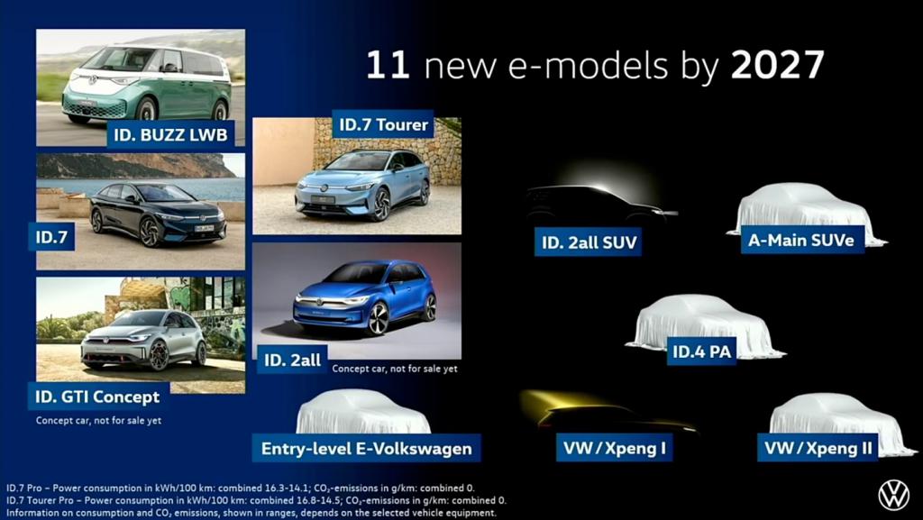 在今年 3 月举行的 2024 年度新闻发布会上,大众汽车宣布将在 2027 年之前推出 11 款全新电动车型,包括两款与小鹏汽车联合打造的车型 VW / Xpeng 1 与 VW / Xpeng 2,这两款车型预计在 2026 年正式上市。