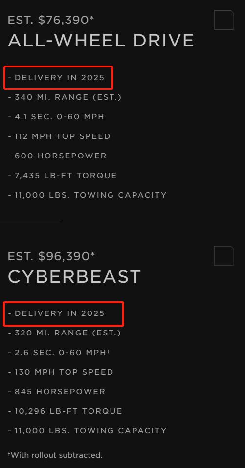该网站显示,全轮驱动版 Cybertruck 和高端 Cyberbeast (野兽版)的预计交付时间都是 2025 年。根据此前的规划,特斯拉最终要实现每年交付 25 万辆 Cybertruck。然而,马斯克曾警告称,这一里程碑不会在今年实现,而要到 2025 年才能实现。